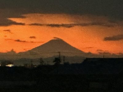 最近は、秋雨前線に向かって暖かく湿った空気が継続的に流れ込んでいて、雨雲が活発に活動しているようです。前線付近では、局地的に雨雲が発達していて、1時間に30~50mmの激しい雨の降るおそれもあり、道路の冠水や低い土地の浸水などに注意が必要だということです。昨日も、午後から川越の天気が急変し、日の入り前にも関わらず、辺りは真っ暗になりました。今日は、このまま雨が降り続くのかなと、会社へ向かっていると。。。。。。      目の前に富士山と夕焼けが!!!何か良いことがおこりそうな予感がします。