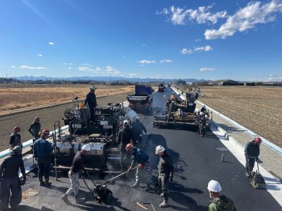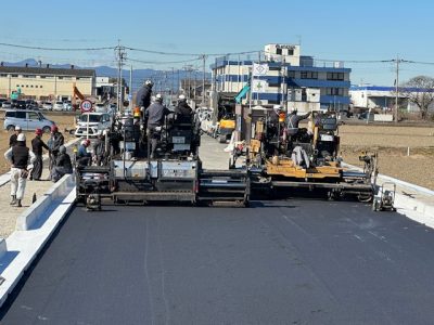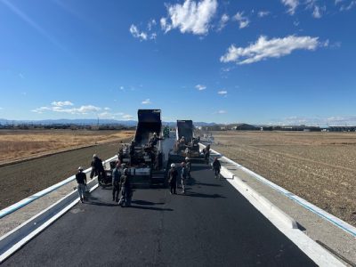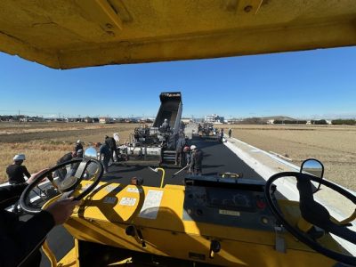 現場はというと、冬の冷たい風が身体中に吹き付ける困難な中、現場を支えていただいている全ての方々のおかげで、本日2月10日、第1回目の舗装を行うことができました。