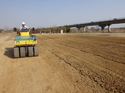 モーターグレーダーでの敷き均しが終わると、タイヤローラー